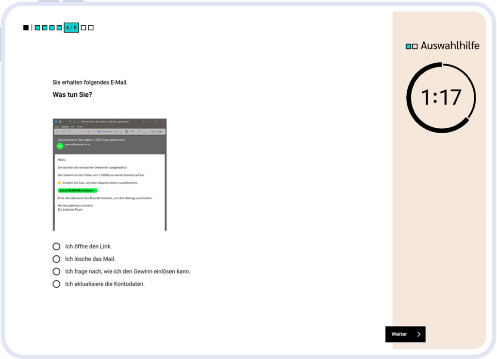 Bewertet wird der richtige Umgang mit Kunden. Dazu werden verschiedene Kundensituationen sowie kunden- und nichtkundenorientierte Reaktionen vorgegeben.